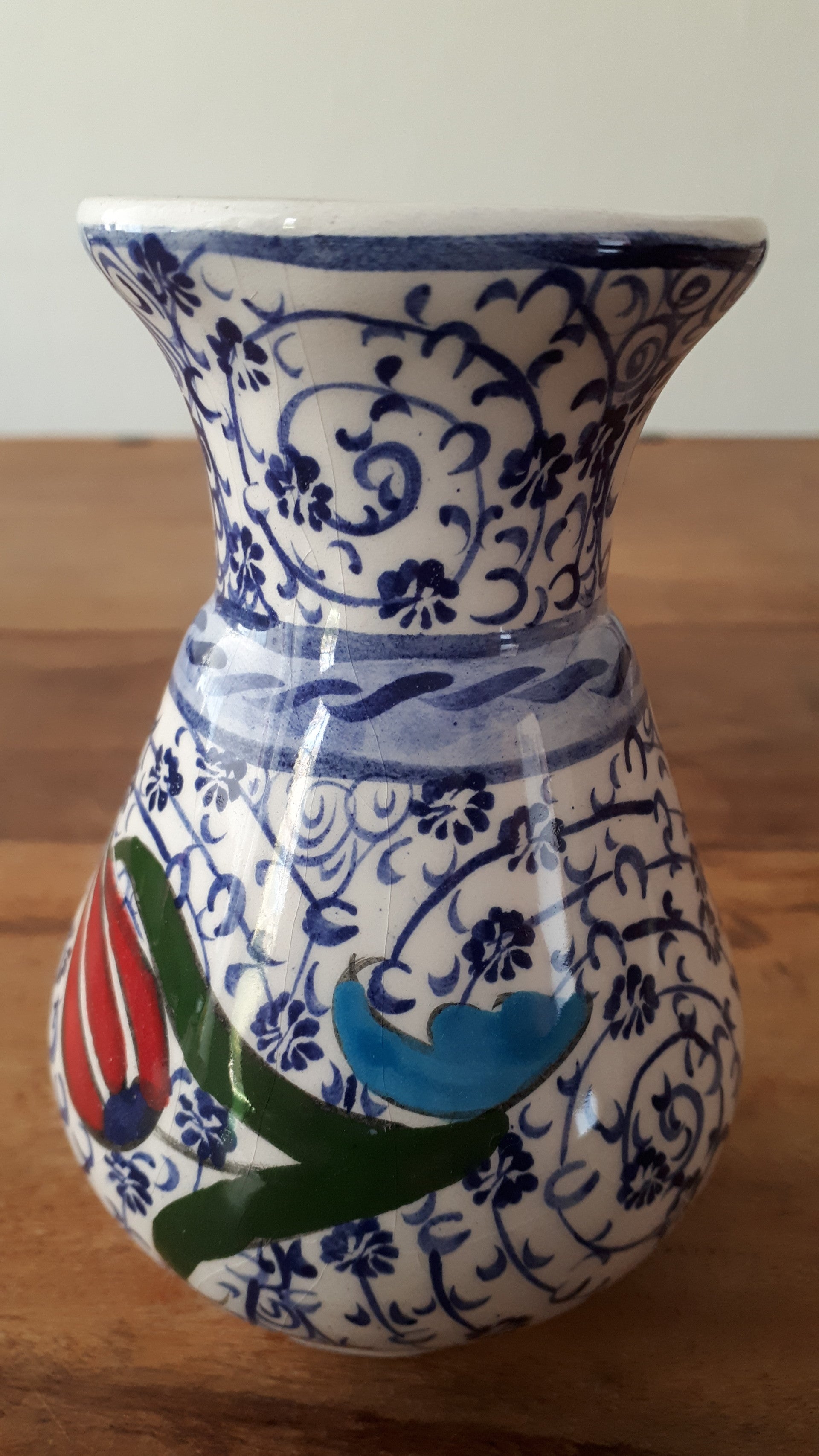 Vaasje met blauw plantenmotief en tulp, 11 cm hoog. Uniek stuk.